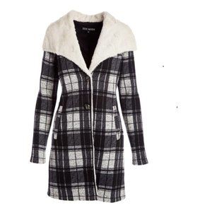 NWT Steve Madden Knit Plaid Black & White Coat with Cream Faux fur Colla…