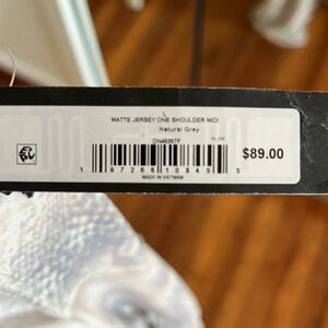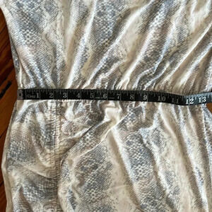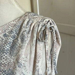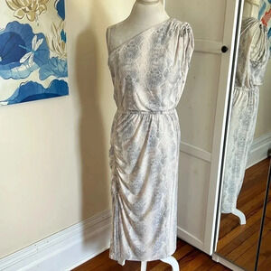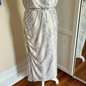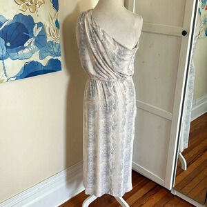 New with tags, Steve Madden matte jersey one shoulder style midi dress in a delicate snakeskin print. This beautiful dress has a gathered detail at the shoulder that can be adjusted with the drawstring. There is also a gathered detailed one one side of the dress with the same adjustable drawstring. Elastic waist.