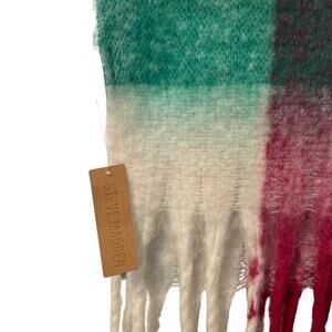 NWT Steve Madden Oversized Checkered Blanket Scarf. Soft and cozy with oversized fringe detail at either end. Beautiful checkered pattern in green, red, blue and ivory.