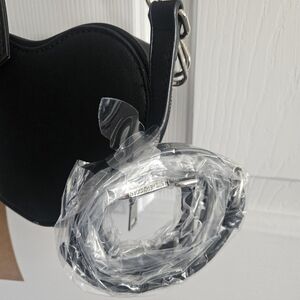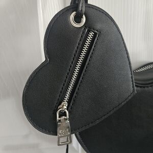 New with tags- Steve Madden Rosi purse featuring a stylish and unique heart shaped crossbody bag, attachable heart shaped mini pouch with zippered closure on back and valentines kisses design, interior zippered pocket, interior black fabric lining, zippered closure top for the purse and interchangeable straps- a black faux leather one and a Steve Madden webbing logo strap. Silver hardware. Purse measures 6 inches width x 5.5 inches height x 4.5 inches depth and the strap has a 23 inch drop. Stock photo is pictured with the logo strap.