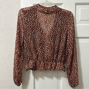 Feel effortlessly chic in this ruffled chiffon printed blouse by Steve Madden. Crafted with 100% polyester. The chic confetti print, ruffled details, and breezy chiffon will make this a desk to dinner essential. It features loose long sleeves and a ruffled waist. Wear it with your favorite jeans or slacks. V-Neck. Pull on.
