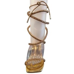 Twinkling crystals trace the slender straps that wrap up and around ankle in a glamorous square-toe sandal lofted by a towering tapered heel.