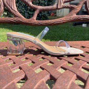 These sandals have a clear acrylic heel and strap for Y2K flair.