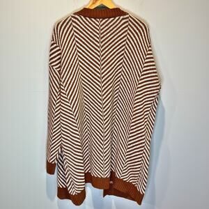 Long length, open front cardigan sweater. Brown and white stripe pattern. Patch pockets. Ribbed trim.