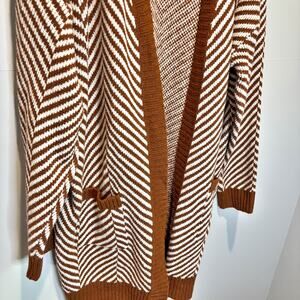 Long length, open front cardigan sweater. Brown and white stripe pattern. Patch pockets. Ribbed trim.
