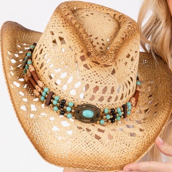 Make a statement with this distinctive cowboy hat. Featuring a unique stained open weave design accented by a stylish beaded band, this hat offers a fresh take on classic Western wear. The intricate craftsmanship and eye-catching details ensure you'll stand out from the crowd with effortless style.