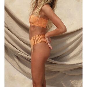 Top is a pull on bandeau style and the bottom is a high cut cheeky bottom with strappy sides. Both size S. Both pieces retail for $85 each.