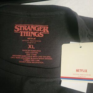 NWT Stranger Things Official Merchandise Black T-shirt (XL) Read Read: item may show some noticeable cosmetic wear, details as shown in photos. Left side top neck shoulder neckline has a hole in it.