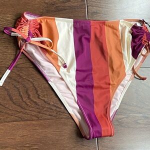 Enjoy the sun in this stylish striped high-waisted bikini bottom. Featuring vibrant purple, orange, and cream colors, this swimwear piece is perfect for a day at the beach.