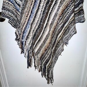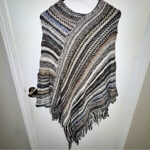 Cozy striped knit poncho with fringe detail. Features a mix of neutral tones.