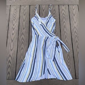 NWT Striped Loft Wrap Mini Dress Size 6 100% Rayon white blue and yellow stripes