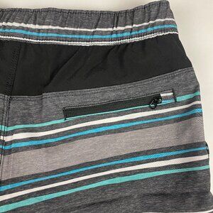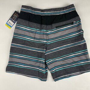 Gray, blue and white striped shorts feature a built in boxer liner. UV protection, quick dry stretch fabric. Zippered back pocket.