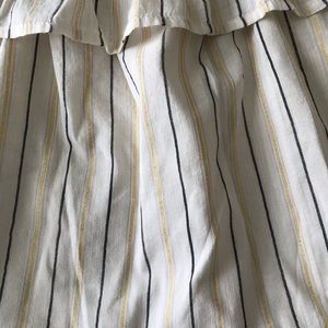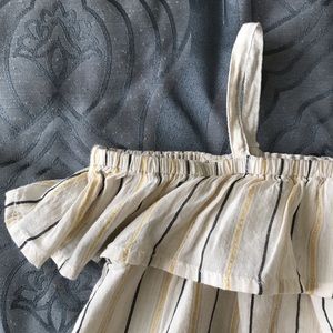 NWT.Spaghetti strap tank with flowing ruffle at the top. Stretchy elastic is soft and comfortable. Off white background with thin blue,grey and gold stripes. Pictures show inner lining. Old Navy size 4t.