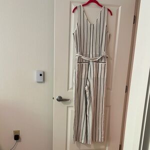 Chic sleeveless jumpsuit with vertical stripes. Features a stylish tie waist and back pockets. NWT, never been worn. Pet and Smoke free home.