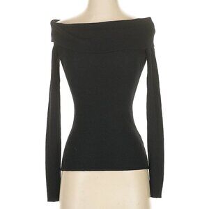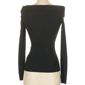 Very high quality stretchy soft light weight wool blend long sleeve off the shoulder sweater, folds over at the top. Ribbed, very flattering and stretchy hits at the waist.