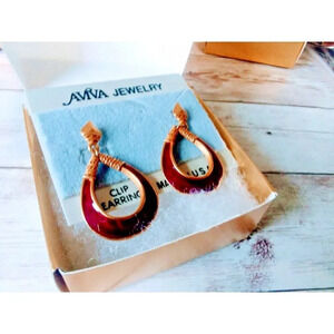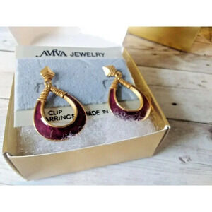 Made by Aviva Jewelry, a brand known for its presence in department stores during that era, these earrings hang just under an inch from the earlobe and feature brass accents with a rich, maroon-red enamel finish.