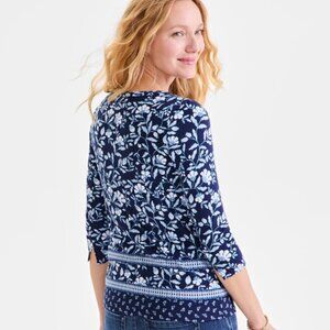 NWT, Style &CO. Floral Cotton Round-Neck Top, 3/4 sleeve, Gram Blue, Small