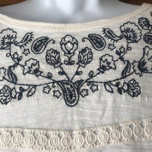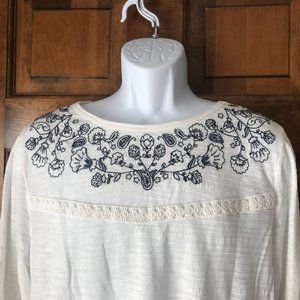 NWT Style & Co Ivory w/Navy Blue Crewel Flowers Top Large