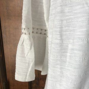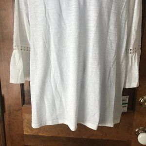 New with Tags; Style & Co; Pullover Top; Large; Ivory with Navy Blue Crewel Flowers; 3/4 Bell Sleeves w/ Lace Inset; Base: 60% Cotton & 40% Polyester; Lace: 100% Cotton; Machine Wash and Tumble Dry; Armpit to Armpit 22"; Armpit to Hem 18"; Sleeve 13"; Length 28"