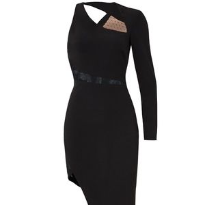 Make a striking statement in this STYLESTALKER one-shoulder sheath styled with asymmetrical paneling. Dotted mesh inserts reveal a sliver of skin for added allure. Black crepe (100% Polyester). Sheath. Long sleeve. One shoulder asymmetrical neckline. Hidden back zipper with hook-and-eye closure. Partially lined. Brand new! Purchased direct from vendor.
