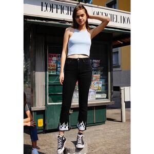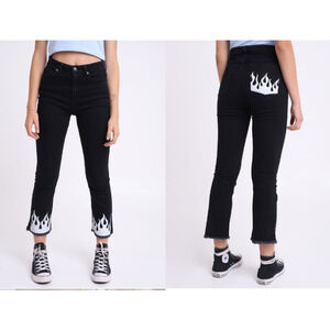 NWT Subdued Black Crop Flare Button Fly Raw Hem Front and Pocket White Flames 26