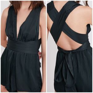Deep V-neck romper, scoop back design, long strips fastening, elastic waist, sleeveless, short length, relaxed fit.