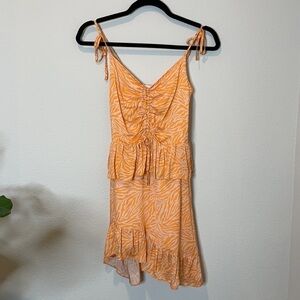 This Suboo mini dress features ruffled accents and fluid ruching, while an orange zebra stripe print makes a bold statement. Swap out flat sandals for strappy heels to take this summer style from day-to-night.