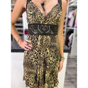 Stunning animal print with beaded underbust and straps. 100% silk outer shell, inner black lined. Side zipper closure.