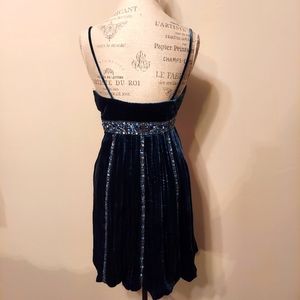 This new with tags dress is in excellent condition. The dress is a peacock blue silk velvet with beading and sequins at the empire waist, vertically down the skirt and at the front of the spaghetti straps.The dress has a bubble hem, is fully lined and has a side zipper. The dress is a size 6 but the brand runs small so if you wear a size 4, this dress will probably fit you so please check measurements. Size 6 Bust 34.5 Waist 26 Hip 36 Length 34