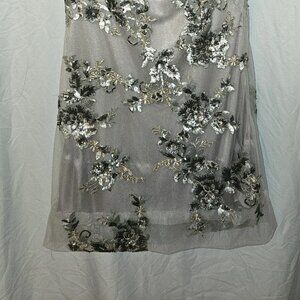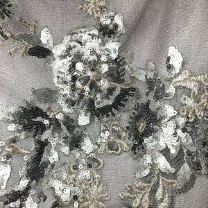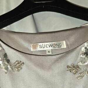 Glamor! Festivities! Sparkle! You'll look like a holiday yourself in this shimmering Sue Wong Nocturne dress, embroidered in nosegays of platinum sequins and silvery thread on an overdress of nylon tulle, with an underdress of silvery jersey-weave polyester. Size 6. Measurements: length 35 inches; shoulder 16 inches; pit to pit 17 inches. From a smoke-free, dog-loving home.