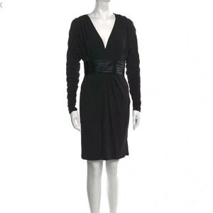 NWT Sue Wong v neck cocktail dress in black. Ruched long sleeves. Open back. Back zip. Jersey knit. Dry clean. Bust 18” waist 14” length 37”. Size 10