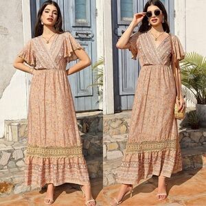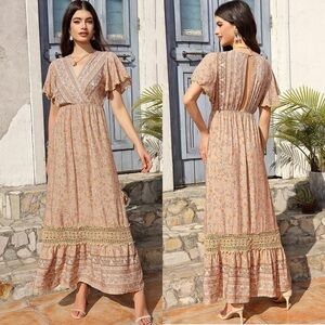 NWT Summer Boho Floral Short Sleeve Maxi Dress Flowy Lace Dress Ruffle Bohemian