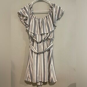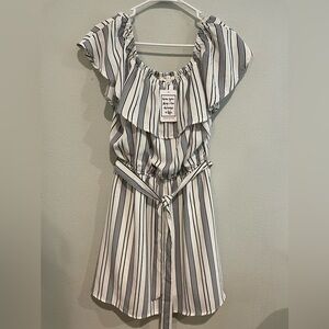 NWT Summer White and Navy Stripe Mini dress by She & Sky. Option of wearing off the shoulder. 100% lined. Cute little tie belt.