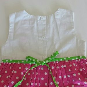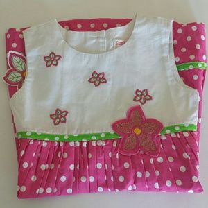 Sweet little pink and white polka dot with embroidered floral accents on this girls size 3T dress. Made by Sunboree, 100% cotton, machine wash cold, tumble dry low, warm iron as needed. Cute, easy, wash and wear!! :)