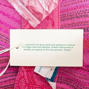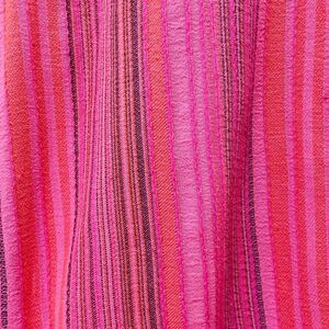 Sundance wide leg pants in a vibrant pink multicolor stripe. Made from a soft cotton-viscose blend, these pants feature a textured woven fabric, drawstring tie waist with zip and button closure, and patch pockets at the back. Relaxed, cropped silhouette perfect for boho, resort, or artisan-beachy looks.