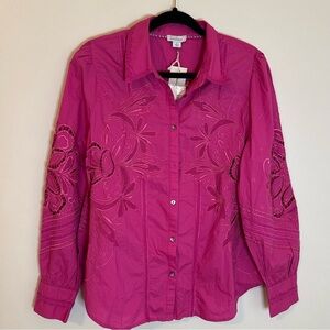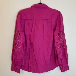 Tonal embroidery lends understated elegance to our textured button-down top with novelty trim detail, ladder lace and shirring at the back yoke. Cotton. Hand wash. Women’s size large.