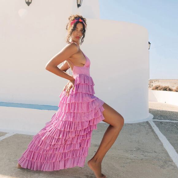 Entirely adorned by sequins lines and silver threads, Elise long dress is defined by an open back and a lingerie style top which can be adjusted on the shoulders thanks to links. A smock at the waist adjusts the dress at your shape. The asymmetric bottom is made up of series of gathered flounces for a sublime fall.