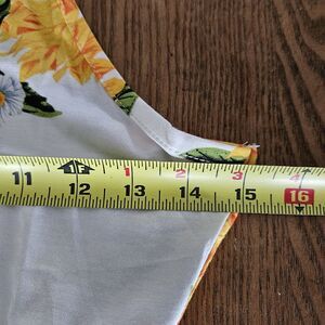 Women’s size Small sunflower-print maxi dress featuring yellow and orange blooms on a pastel background. No sleeve bodice, elastic waist for shape retention, V-neck collar—feminine, breezy, and perfect for summer days or casual outings.
