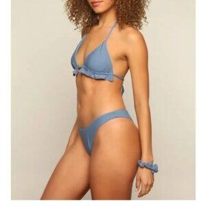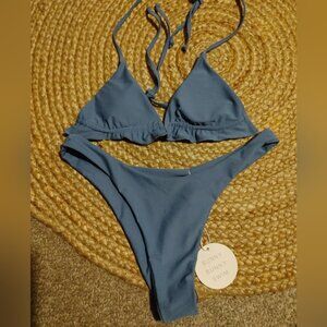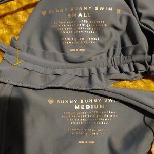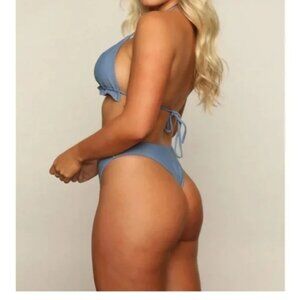 NWT Sunny Bunny Bikini Willow Ellie Stone Blue S\M two-piece matching set Ellie top ruffle detail fully adjustable back tie and halter neck tie padded cups Willow bottoms high rise cheeky thongs please note the top is a size small , bottoms are a size medium new with tag. hygienic liners still intact