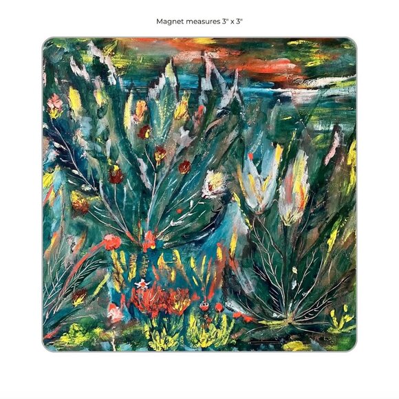 This large high quality magnet features my mother's painting known as Sunset Garden. The painting is directly printed on to the magnet, it is not a glued cut out. Brand new and made for the purpose of resale. Please note, the magnet may appear larger on the photo with the refrigerator for easier viewing.