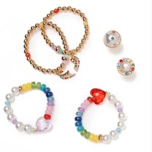 Includes 4 ultra stretchy bracelets and 2 adjustable faux pearl rings with rainbow accents.