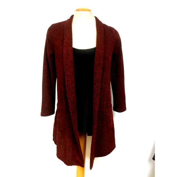 Pretty Woman burgundy, long cardigan with long sleeves, shawl collar and pockets. Perfect for work with slacks or a skirt or with jeans and boots for a fun afternoon. Size S has a chest of 19" across.
