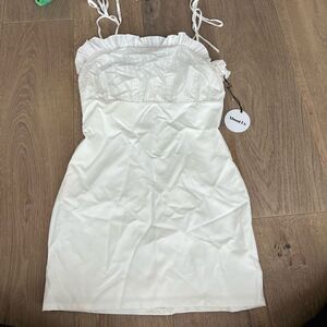 Self & Lining: 100% poly. Hand wash cold. Fully lined. Shoulder tie straps. Embroidered fabric bodice with ruffle trim. Hidden back zipper closure. Imported. Revolve Style No. SPDW-WD343. Manufacturer Style No. AUD405 R18.