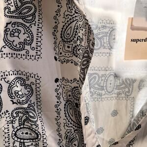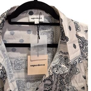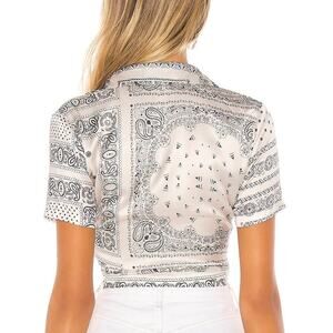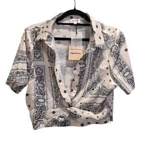 A cute cream and black cropped shirt in satin fabric with front twist detail and hidden side zipper closure.