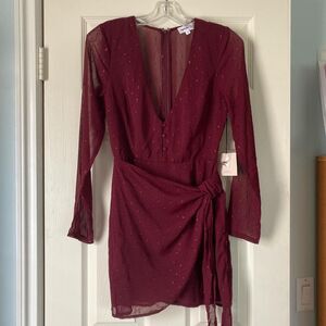 NWT new with tags superdown mini faux wrap dress in size S -Maya dress -Zipper in the back and metallic threads -Dark red / burgundy / maroon color -Sheer back -Size small #nye #holiday #sexy #clubbing