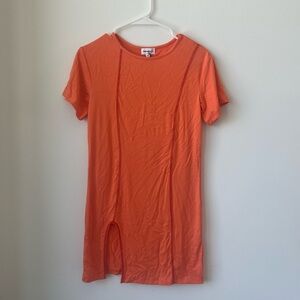 Orange with pink stitching and a side slit. Never worn, didn’t fit but missed the return window.