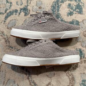 Super cute Superga Ecru gray faux shearling lace-up slip-on sneaker. Cozy and cute for fall/ winter! Women’s size 10. New with tags attached! Would make a great gift!