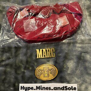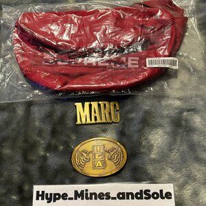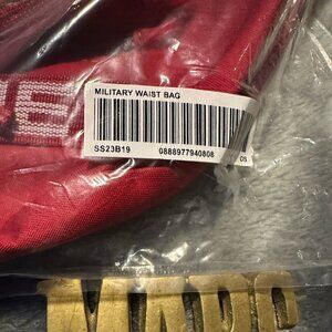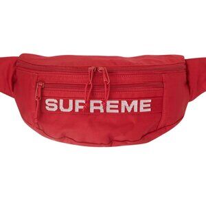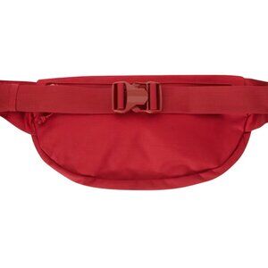 The Red version of the Supreme Field Waist Bag, an accessory sometimes referred to as a " fanny pack," is crafted from a red water-resistant cotton nylon blend. Inside this item, you'll find a lining with an embossed Supreme logo. The main zippered compartment of this waist pack comprises an interior organizer pocket so that it works well whether you are literally hiking through a field or running errands on the city streets. There are additional pockets with zippers in the front of the pack for easy access and in the back of the pack for items you want to keep a bit more secure. You affix this bag around your waist with an adjustable red strap.