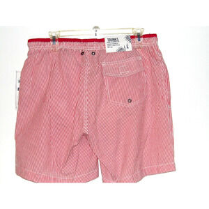 The NWT Surf & Swim Trunks in men's size L feature a stylish striped seersucker design in red, with a mesh lining for added comfort. Made from 100% polyester, these swim trunks are machine washable and perfect for surfing and other water activities. The brand, Trunks Surf & Swim Co, offers a modern and patriotic vibe, making these trunks a great choice for those who appreciate nautical and outdoor themes. Whether you're hitting the beach or the waves, these lined trunks are a fashionable and functional addition to your swimwear collection.