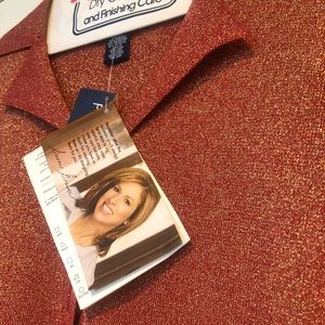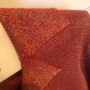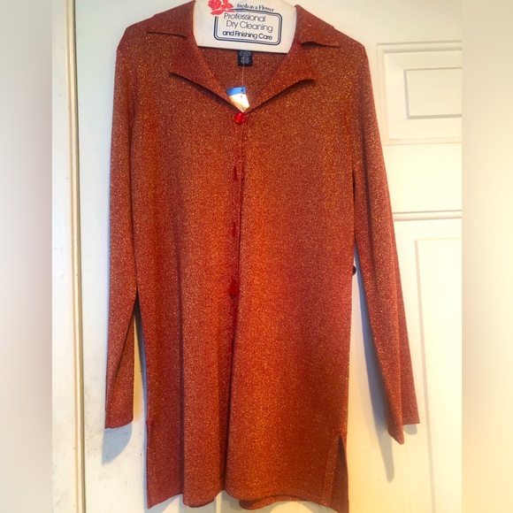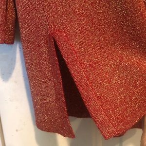 Beautiful burnt orange tunic length cardigan with gold metallic threads. Light weight sweater knit, shirt collar, orange buttons and side slits. Not flashy but a beautiful metallic finish. Not scratchy.